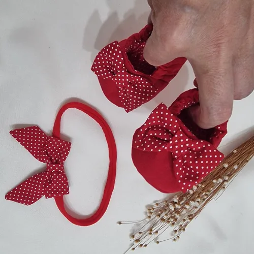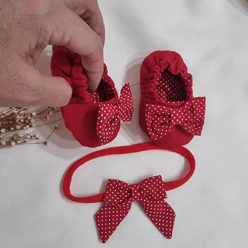 O sapatinho, em modelo pantufa anatômica, é confeccionado em tecido 100% algodão vermelho vibrante, com forro interno em poá (bolinhas brancas), garantindo maciez e um acabamento impecável. A faixa de cabelo é feita em material elástico macio, que acompanha o crescimento da bebê sem apertar. O grande destaque são os laços estruturados com estampa de poá, que trazem um charme lúdico e clássico para qualquer ocasião.