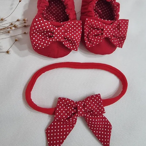 O clássico que nunca sai de moda! O Conjunto Lady Poá traz a energia do vermelho combinada com a delicadeza das bolinhas brancas. Composto por um sapatinho pantufa e uma faixa de cabelo com laço max, este kit é a escolha perfeita para quem busca um visual marcante, alegre e extremamente confortável.
