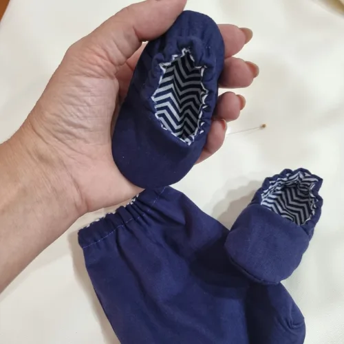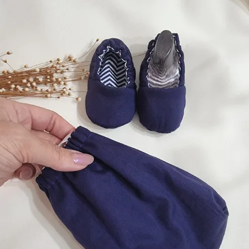 O sapatinho é confeccionado em tecido 100% algodão azul-marinho liso por fora, revelando um interior surpreendente com estampa chevron em azul e branco. A modelagem anatômica com elástico garante que o calçado acompanhe os movimentos do bebê com total segurança. O saquinho organizador, no mesmo tema, é ideal para levar na bolsa de maternidade ou proteger o sapatinho em viagens.