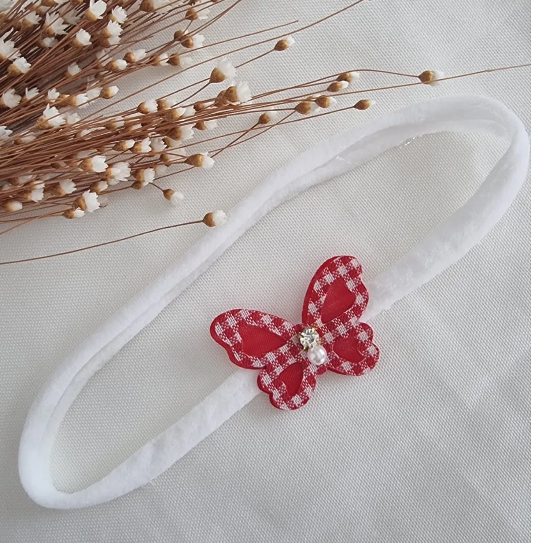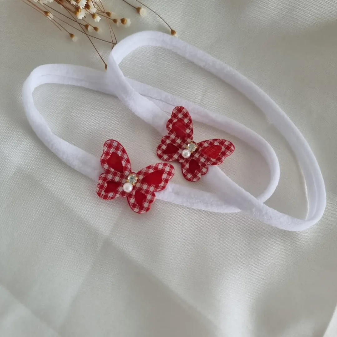 Faixa de Cabelo Borboleta Xadrez – Vermelho & Branco